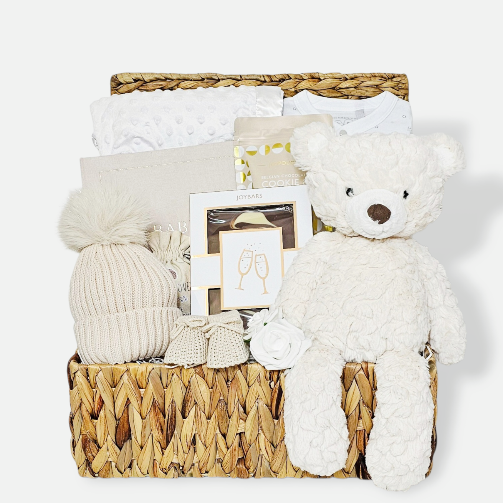 Our Premium Neutral Baby Gift Hamper is a beautifully curated gift designed to celebrate a new arrival while making new parents feel truly special. Thoughtfully presented in a natural water hyacinth hamper and finished with a soft satin ribbon, this elegant baby hamper is perfect for welcoming a newborn in a timeless, neutral style.