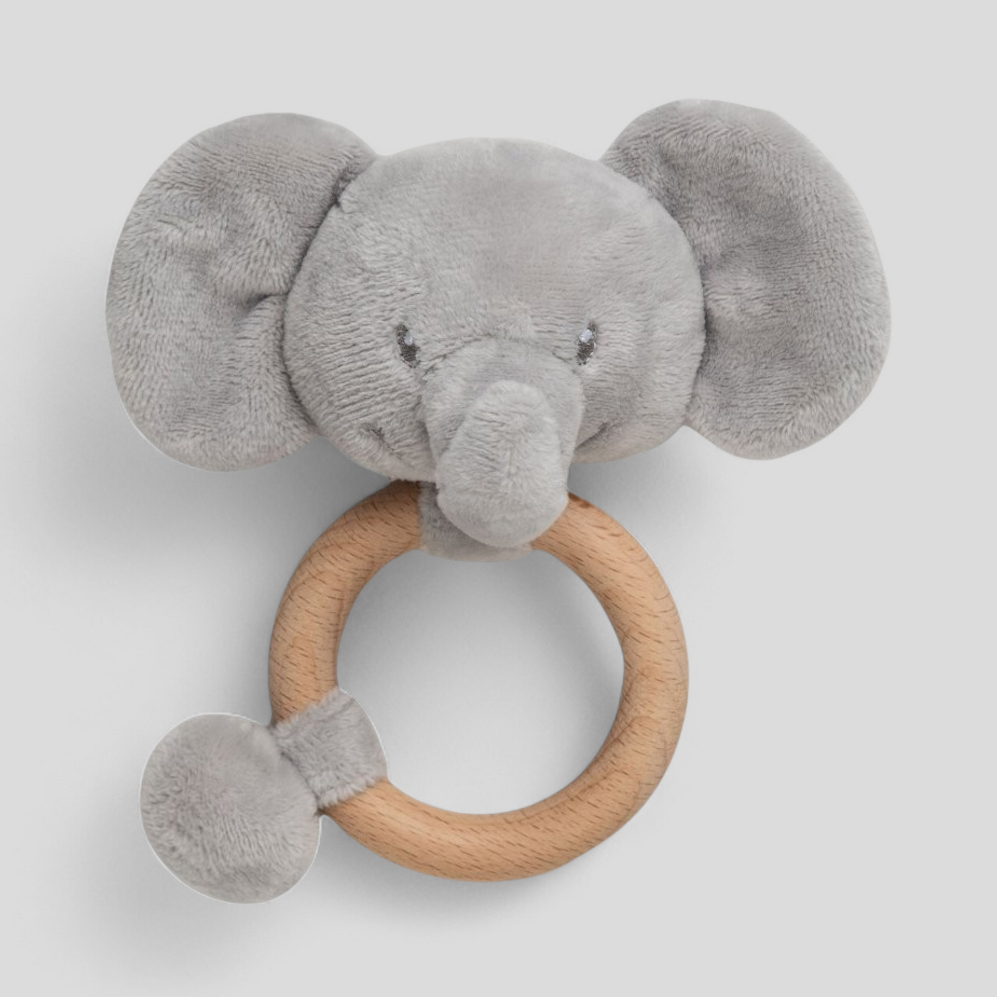 The plush dressing gown wraps baby in warmth and softness, while the matching elephant comforter provides reassurance and comfort. The wooden ring elephant rattle supports early sensory development and makes a beautiful natural keepsake.