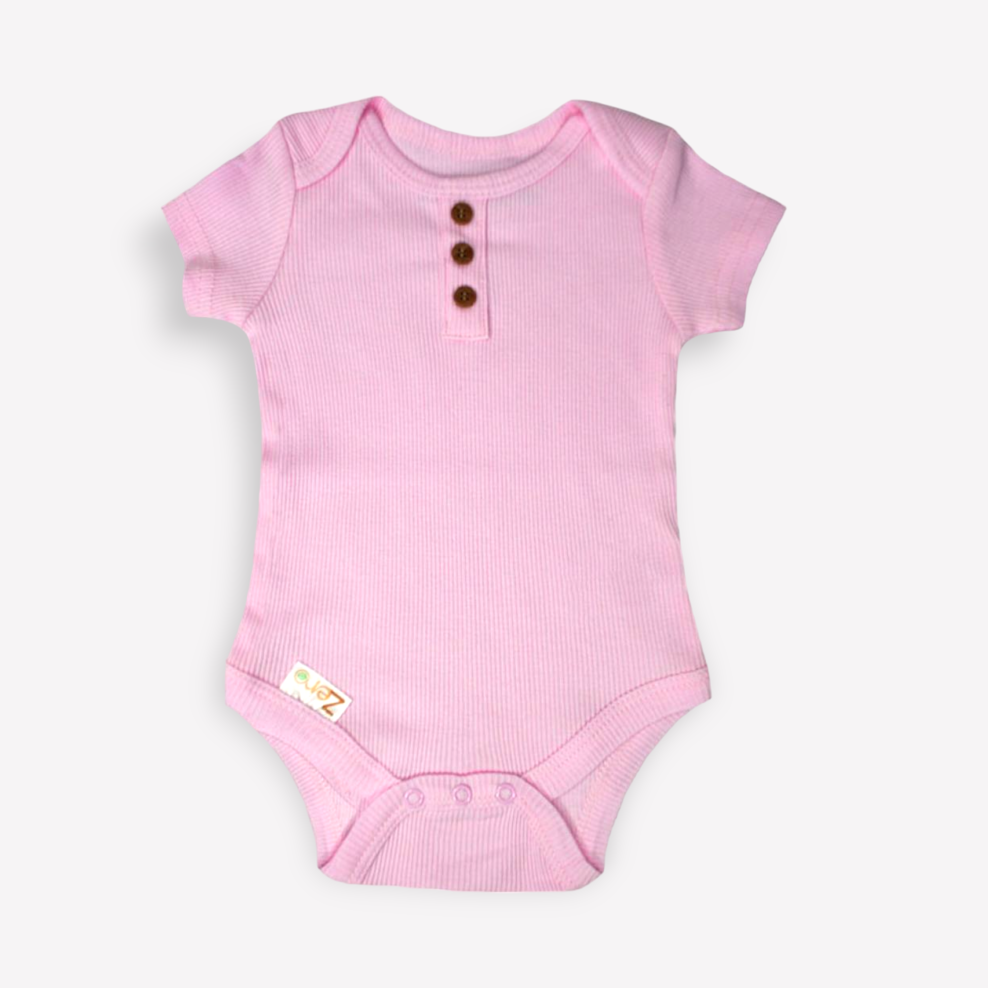Light pink envelope neck ribbed bodysuit with faux wooden button detail and press stud fastening.