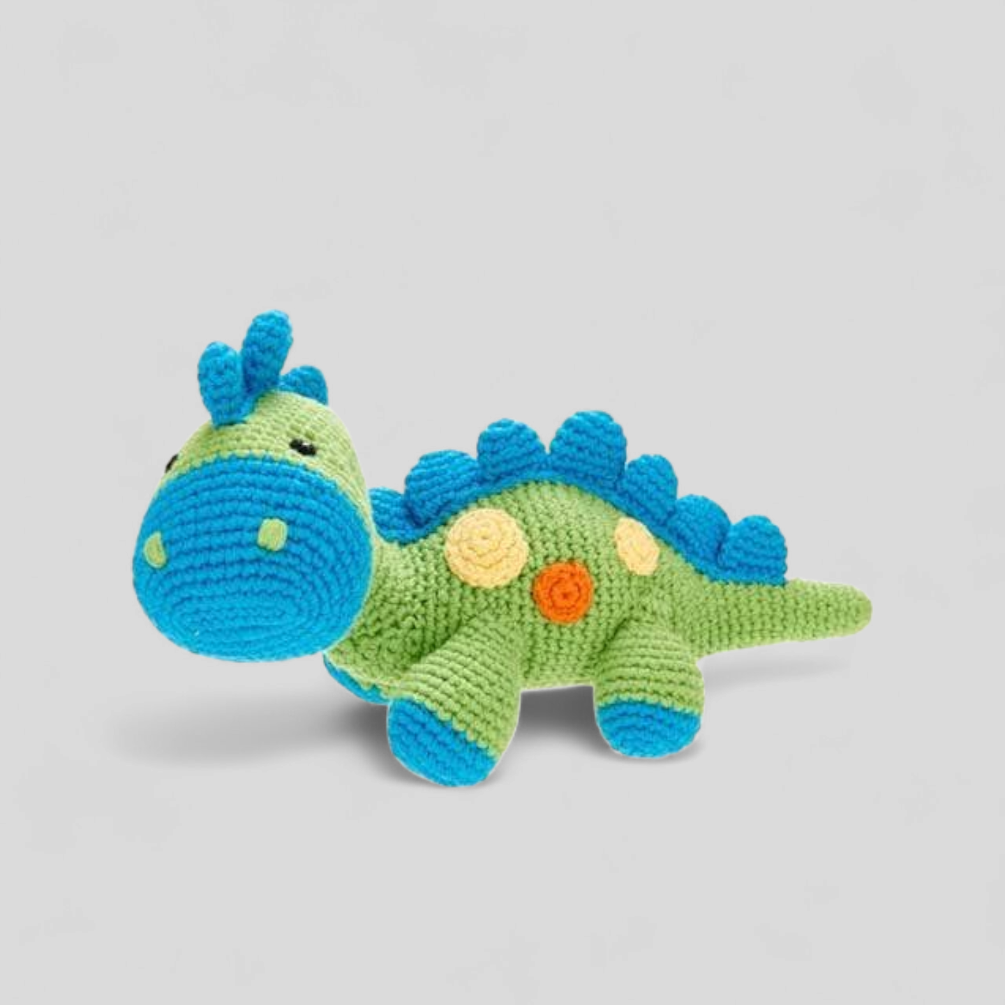 -Organic Cotton Crochet Dinosaur Rattle – Green – Handmade from organic cotton, this adorable dinosaur rattle is gentle, safe, and perfect for little hands to explore.