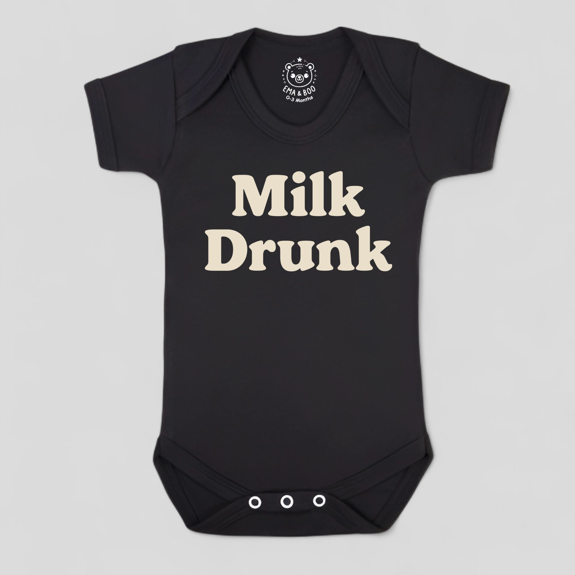 Bold and modern, our Milk Drunk Bodysuit in black with off-white writing is part of our exclusive MonoCub collection. Crafted from 100% cotton, this stylish monochrome baby bodysuit is breathable, comfortable, and gift-ready. A standout choice for parents who love modern baby clothes.